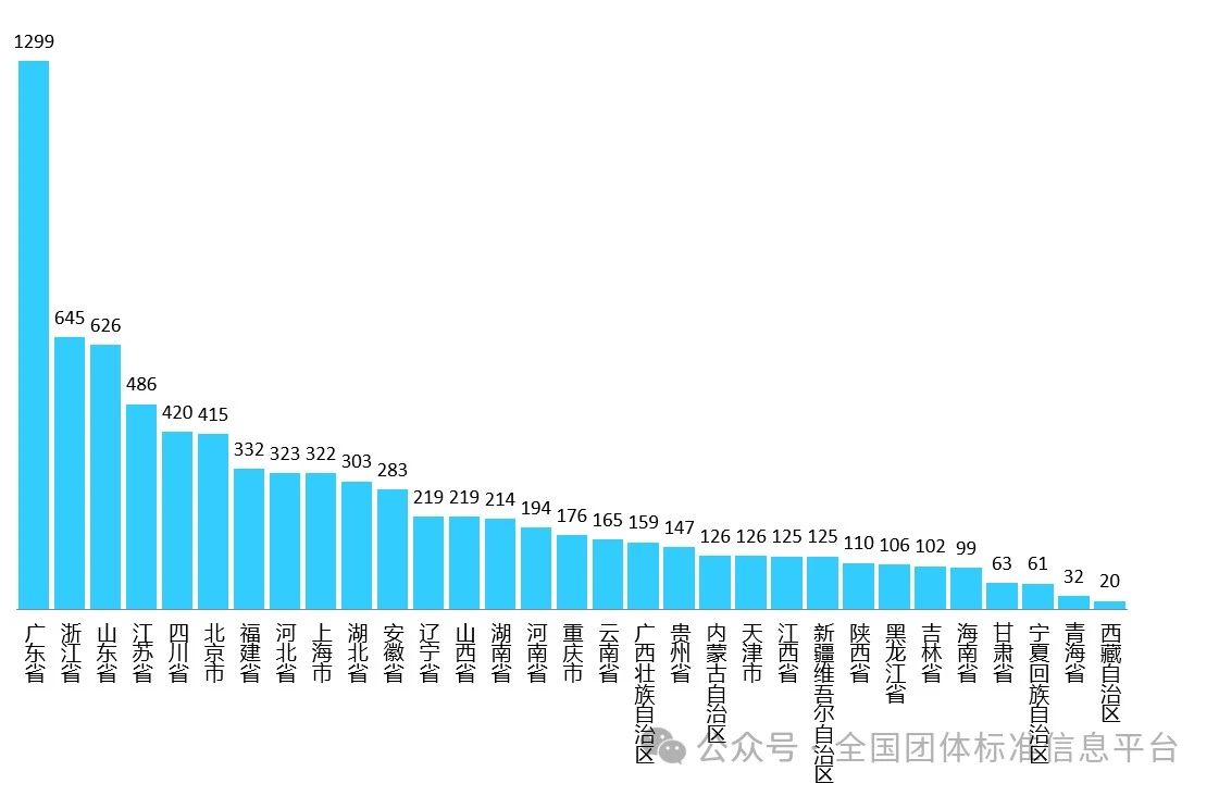 截至2024年6月30日,廣東省、浙江省、山東省、江蘇省等31個(gè)省、自治區(qū)、直轄市的社會(huì)團(tuán)體在全國(guó)團(tuán)體標(biāo)準(zhǔn)信息平臺(tái)注冊(cè),其中廣東省社會(huì)團(tuán)體注冊(cè)數(shù)最多,為1299家,占社會(huì)團(tuán)體注冊(cè)總數(shù)的14.3%。