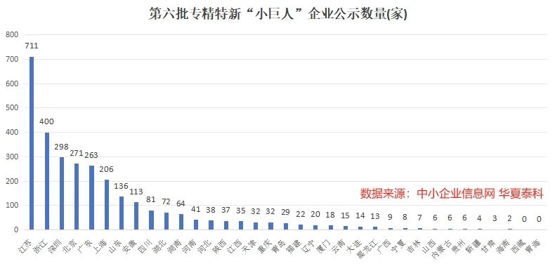 第六批專精特新企業的分布省市情況呈現出明顯的地域差異,經濟大省的小巨人企業數量遙遙領先。在此次公示的第六批專精特新 小巨人企業中,江蘇、廣東(含深圳)和浙江數量較多,分別有711家、561家和400家,三個省份小巨人企業數量占比超過一半。