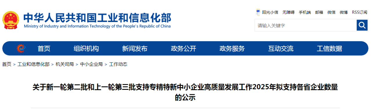 為深入貫徹習(xí)近平總書記關(guān)于促進(jìn)中小企業(yè)專精特新發(fā)展的重要指示精神,按照《財(cái)政部 工業(yè)和信息化部關(guān)于進(jìn)一步支持專精特新中小企業(yè)高質(zhì)量發(fā)展的通知》(財(cái)建〔2024〕148號)和《關(guān)于開展第三批第二年財(cái)政支持專精特新“小巨人”企業(yè)高質(zhì)量發(fā)展績效評價(jià)工作的函》(工企業(yè)函〔2025〕27號),現(xiàn)將新一輪第二批和上一輪第三批支持專精特新中小企業(yè)高質(zhì)量發(fā)展工作2025年擬支持各省企業(yè)數(shù)量向社會公示,公示時(shí)間為5月30日-6月6日。