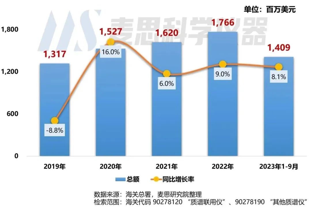 根據(jù)中國海關(guān)總署最新數(shù)據(jù)顯示,2023年1-9月我國質(zhì)譜儀器進(jìn)口金額為14.1億美元,折合人民幣約100億元,同比上升8.1%,可見,國內(nèi)市場(chǎng)對(duì)于進(jìn)口質(zhì)譜儀器的需求依然保持旺盛,今后國內(nèi)質(zhì)譜需求可能在相當(dāng)長一段時(shí)間內(nèi)仍將依賴進(jìn)口。不過質(zhì)譜自主研發(fā)及國產(chǎn)替代的政策利好形勢(shì)已經(jīng)非常明朗,且越來越多的科研用戶也開始接納國產(chǎn)品牌,隨著國產(chǎn)質(zhì)譜技術(shù)的突破以及產(chǎn)品的成熟,國產(chǎn)質(zhì)譜儀器市場(chǎng)份額將會(huì)持續(xù)上漲。