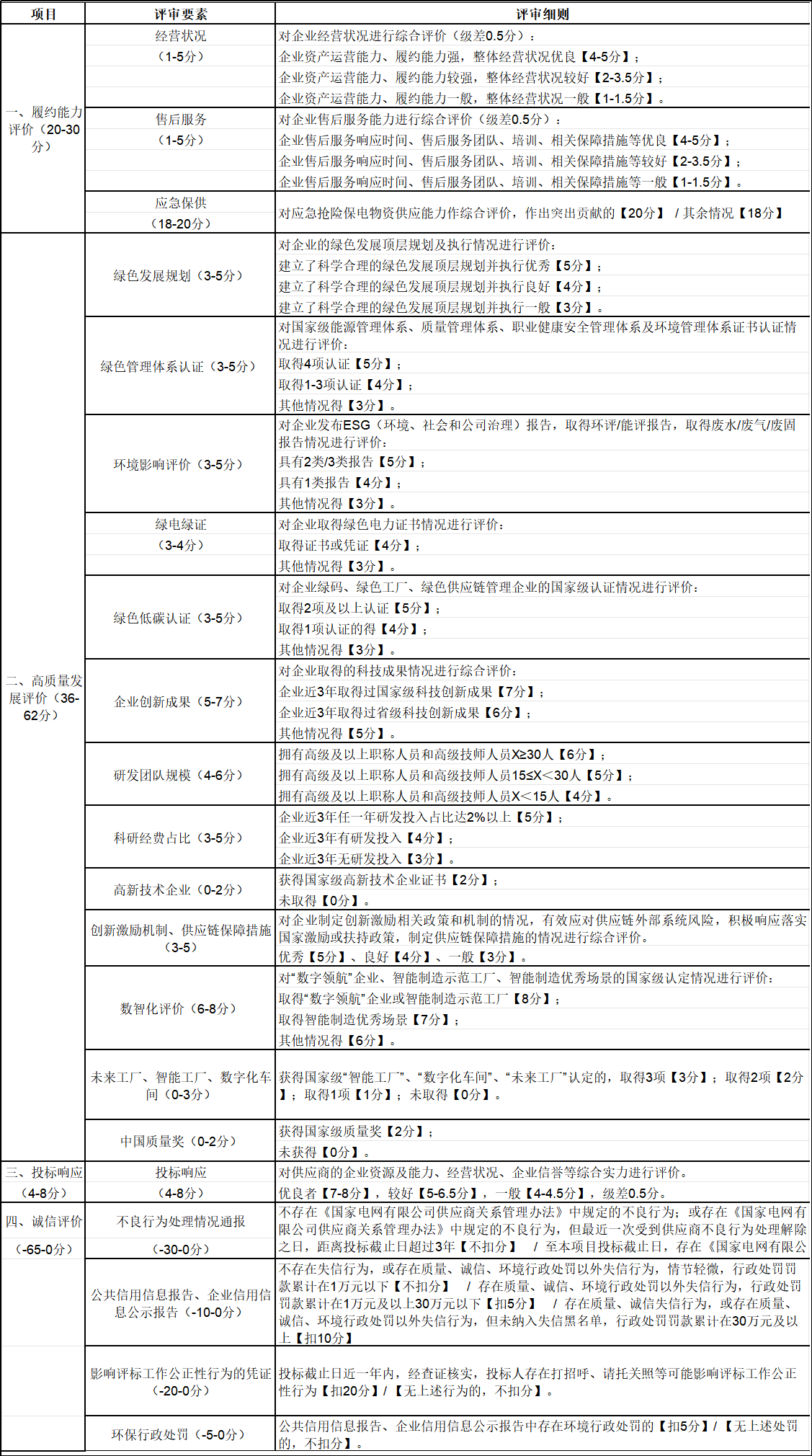商務(wù)評(píng)分更加看重企業(yè)的高質(zhì)量發(fā)展和誠(chéng)信評(píng)價(jià),光“綠色”相關(guān)的評(píng)審項(xiàng)就達(dá)到24分;誠(chéng)信評(píng)價(jià)改為扣分制,新增了“影響評(píng)標(biāo)工作公正性行為的憑證”、“環(huán)保行政處罰”兩項(xiàng)評(píng)審要素,最多分別可扣分20分和5分,對(duì)不良行為中的行賄行為加大了懲罰力度,扣分直接加倍(這一條我覺(jué)得有點(diǎn)針對(duì)的意思了)。