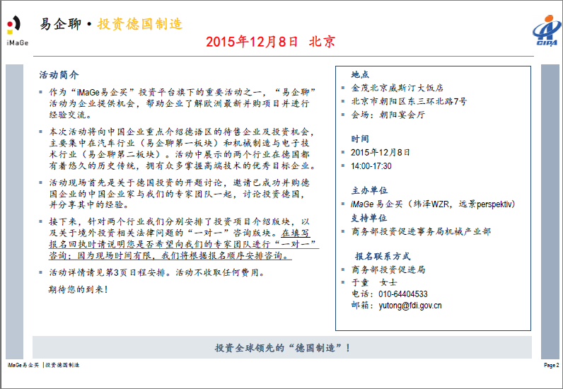 由商務部投資促進事務局支持的《投資德國制造項目介紹會》將于12月8日在北京召開,詳情如下。