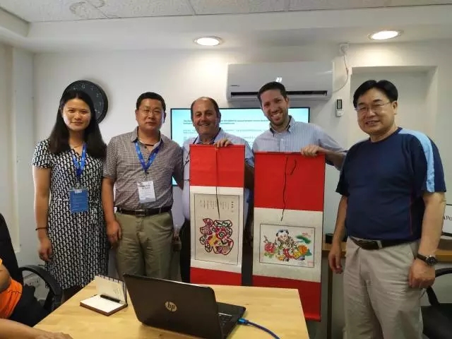 參觀交流結(jié)束后,考察團班長(右一)中國文化辦公設(shè)備制造行業(yè)協(xié)會副理事長焦延和、副班長(左二)中國儀器儀表行業(yè)協(xié)會分析儀器分會秘書長曾偉向以方企業(yè)贈送具有中國特色的禮物
