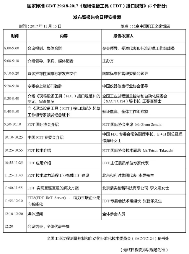 本次發(fā)布會將邀請國家標(biāo)準(zhǔn)化管理委員會領(lǐng)導(dǎo)宣讀推薦性國家標(biāo)準(zhǔn)發(fā)布文件并由中國儀器儀表行業(yè)協(xié)會領(lǐng)導(dǎo)致辭,FDT國際協(xié)會主席 Glenn Schulz先生和中國FDT專委會常務(wù)副理事長、E+H副總經(jīng)理譚海玲女士將分別對FDT國際組織的發(fā)展情況以及中國FDT的發(fā)展情況進(jìn)行介紹,FDT國際組織技術(shù)副總 Tetsuo Takeuchi先生將圍繞FDT技術(shù)的最新進(jìn)展進(jìn)行闡述,北京和利時(shí)集團(tuán)和北京鼎實(shí)創(chuàng)新科技有限公司作為企業(yè)代表將重點(diǎn)探討FDT技術(shù)在國內(nèi)的研發(fā)和具體應(yīng)用。此外,SAC/TC124秘書長王春喜博士將代表標(biāo)準(zhǔn)起草工作組介紹FDT接口規(guī)范(6個(gè)部分)的國家標(biāo)準(zhǔn)的制定、審查過程和工作情況。屆時(shí),將有接近百名業(yè)內(nèi)專家與行業(yè)用戶代表齊聚一堂,彼此交流多年的項(xiàng)目心得和實(shí)戰(zhàn)經(jīng)驗(yàn),探討智能制造最前沿的熱點(diǎn)話題,提出各自的見解和最新的想法,共同探尋智能制造和FDT設(shè)備集成技術(shù)的應(yīng)用及未來發(fā)展趨勢。