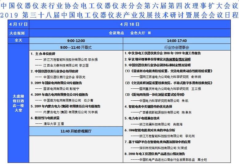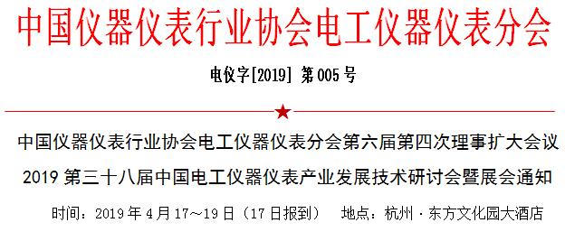 中國(guó)儀器儀表行業(yè)協(xié)會(huì)電工儀器儀表分會(huì)定于 2019 年4月17~19日在杭州東方文化園大酒店召開(kāi)“2019 第三十八屆中國(guó)電工儀器儀表產(chǎn)業(yè)發(fā)展技術(shù)研討會(huì)暨展會(huì)”,同期召開(kāi)“中國(guó)儀器儀表行業(yè)協(xié)會(huì)電工儀器儀表分會(huì)第六屆第四次理事擴(kuò)大會(huì)議”、“中國(guó)儀器儀表行業(yè)協(xié)會(huì)團(tuán)體標(biāo)準(zhǔn)系列會(huì)議”。