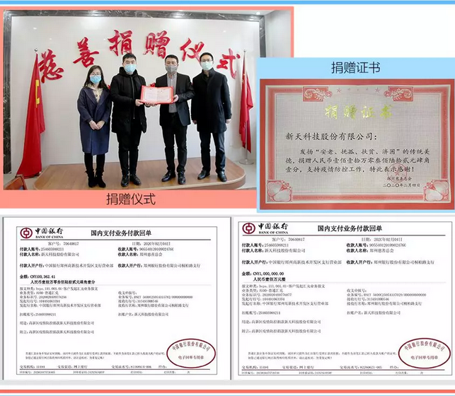 在新天科技董事長(zhǎng)費(fèi)戰(zhàn)波先生、總經(jīng)理常明松先生的支持關(guān)注和帶領(lǐng)下,全體員工踴躍捐贈(zèng),短短一天時(shí)間,員工通過(guò)微信自發(fā)捐贈(zèng)10余萬(wàn)元,同時(shí)新天科技股份有限公司捐贈(zèng)100萬(wàn)元,累計(jì)捐贈(zèng)善款110余萬(wàn)元,全部匯入鄭州慈善總會(huì)賬戶,用于鄭州市以及高新技術(shù)開發(fā)區(qū)新型冠狀病毒肺炎疫情的防控工作。公司總經(jīng)理常明松表示,困難面前,同舟共濟(jì);共同助力,責(zé)無(wú)旁貸;我們要萬(wàn)眾一心,我們一定能戰(zhàn)勝疫情!同時(shí)也提醒特殊時(shí)期新天公司全體員工也要保護(hù)好自己和家人!