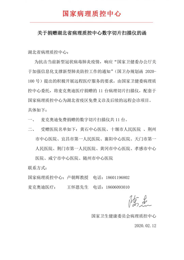 作為平臺技術支持單位的麥克奧迪收到信息之后,當即決定捐贈11臺的最新數字切片掃描設備支援湖北抗擊疫情,以配合國家病理質控中心為湖北省疫區開展義診及后續的遠程會診項目。