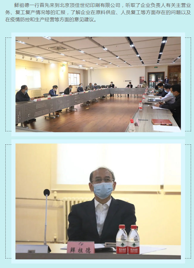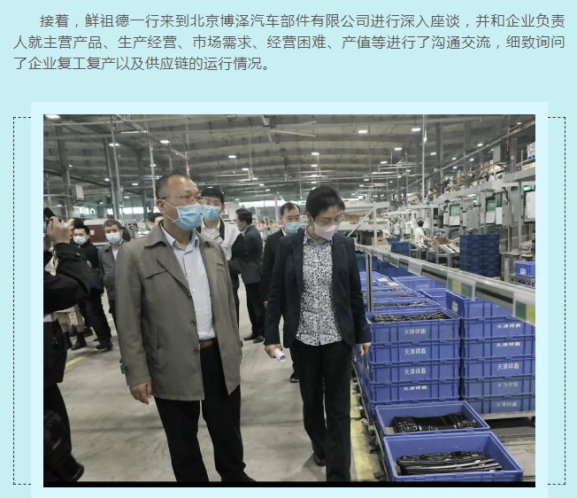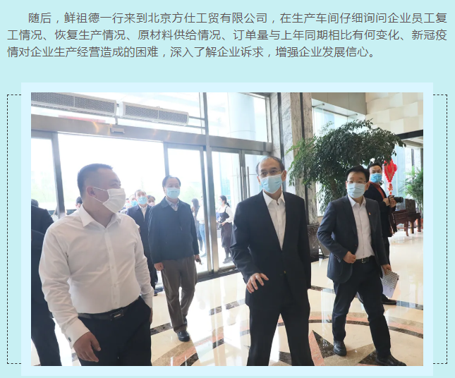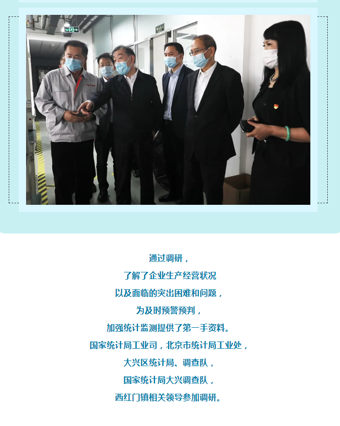 為充分發(fā)揮統(tǒng)計部門優(yōu)勢,及時客觀了解新冠疫情對小微企業(yè)的影響,進一步把脈疫情對工業(yè)經(jīng)濟的影響程度,準確把握小微工業(yè)企業(yè)的需求和期待,4月15日,國家統(tǒng)計局黨組成員、副局長鮮祖德一行深入大興區(qū)小微工業(yè)企業(yè)一線,開展現(xiàn)場調研。北京市政府副秘書長王文杰、北京市統(tǒng)計局局長蔣力歌、國家統(tǒng)計局北京調查總隊總隊長徐榮華、國家統(tǒng)計局工業(yè)司副司長張衛(wèi)華、北京市統(tǒng)計局副局長吳萬標、大興區(qū)常務副區(qū)長高念東陪同調研。