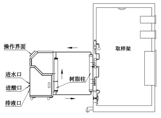 取樣架上發生樹脂失效時,運行管路直接連接到再生裝置上,再生裝置上預留兩個樹脂柱安裝位,可存放新樹脂柱,保證系統運行取樣的連續不間斷;空出的失效樹脂柱與再生裝置連接,啟動再生升系統,等待系統完成再生即可更換到主用樹脂柱上繼續運行取樣。