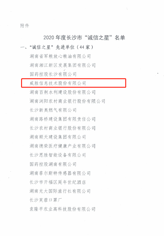 為推進長沙市社會信用體系建設,提高全社會信用水平,樹立“信用長沙”品牌,營造優(yōu)良營商環(huán)境,根據《長沙市2020年“誠信之星”評選活動方案》要求,經過層層推薦、審核、評審,威勝信息技術股份有限公司榮獲長沙市社會信用體系建設領導小組辦公室頒發(fā)的“誠信之星”榮譽稱號。