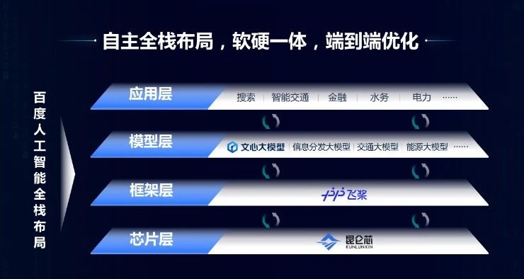 這方面百度有比較明顯的優(yōu)勢(shì),我們?cè)谒膶赢?dāng)中每一層都有比較領(lǐng)先的產(chǎn)品,比如說(shuō)芯片層有昆侖芯。這個(gè)也做了有十年之久,最早是因?yàn)樗阉鲬?yīng)用需要,我們買(mǎi)別人的芯片,畢竟太貴了,所以自己開(kāi)發(fā)了。框架層是飛槳,飛槳今天在中國(guó)的市場(chǎng)份額第一。在模型層是文心大模型,其實(shí)除了文心一言,它是對(duì)標(biāo)ChatGPT的之外,我們還有很多行業(yè)大模型,如交通大模型、能源大模型等。應(yīng)用層的話(huà),像百度搜索等都是我們比較領(lǐng)先的應(yīng)用。