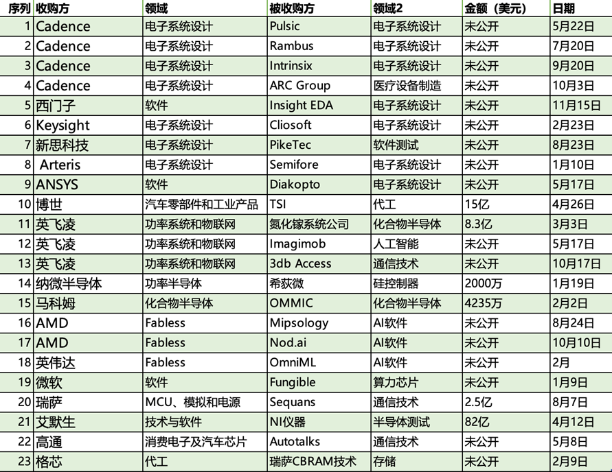 2023年,半導(dǎo)體市場(chǎng)的逆風(fēng)周期仍未過去,企業(yè)收并購的腳步卻不曾停歇。根據(jù)公開的信息,記者梳理了23樁半導(dǎo)體領(lǐng)域的國際收并購案例,發(fā)現(xiàn)2023年全球半導(dǎo)體領(lǐng)域的收并購案主要集中在AI、EDA、寬禁帶半導(dǎo)體等領(lǐng)域,呈現(xiàn)以下特點(diǎn)。