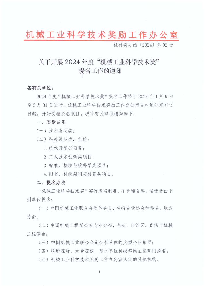 附件1:關(guān)于開展2024年度"機(jī)械工業(yè)科學(xué)技術(shù)獎(jiǎng)"提名工作的通知原件 (PDF)