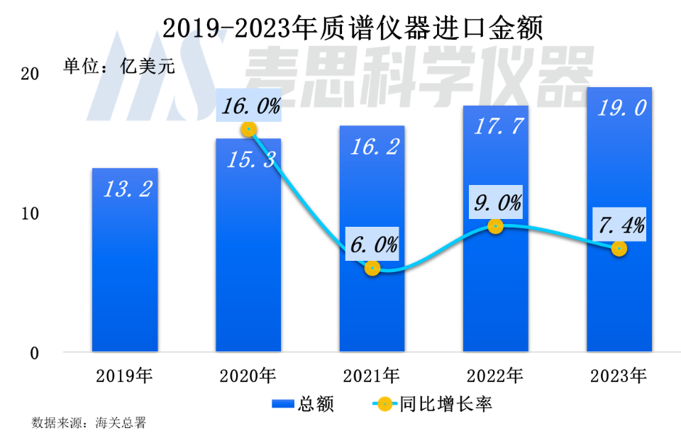2023年我國質譜儀器(含質譜聯用儀和其他質譜儀)進口金額達19.0億美元(約合人民幣133億元),同比上升7.4%。進口質譜需求依然旺盛。