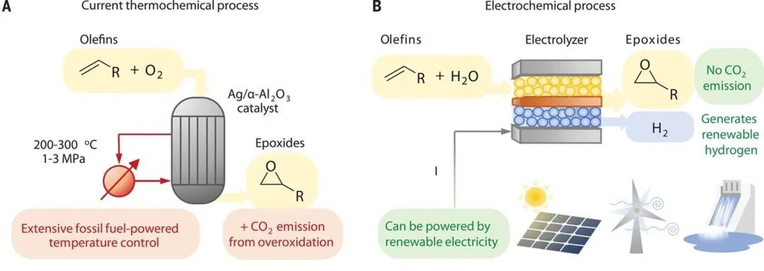 加拿大多倫多大學(xué)Edward H. Sargent院士課題組采用電化學(xué)合成法,借助氧化還原介質(zhì)氯離子,在常溫常壓下達(dá)成電極和乙烯之間的電子交換,將乙烯成功轉(zhuǎn)化為環(huán)氧乙烷和環(huán)氧丙烷(圖B)。相對(duì)于傳統(tǒng)熱合成環(huán)氧乙烷/環(huán)氧丙烷的嚴(yán)苛條件,如高溫高壓(200-300°C,1~3Mpa),Ag催化乙烯完成環(huán)氧乙烷的合成(圖A),且生產(chǎn)1噸的環(huán)氧乙烷就會(huì)同時(shí)排放0.9噸的CO2, 文中采用綠色電化學(xué)方法實(shí)現(xiàn)了零碳排、更溫和和更具選擇性的環(huán)氧乙烷/環(huán)氧丙烷的合成,有望代替苛刻的熱合成法,實(shí)現(xiàn)工業(yè)化,文章發(fā)表在Science上[2]。