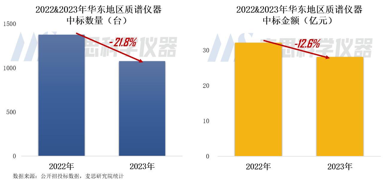 2023年華東地區(qū)質(zhì)譜儀器中標(biāo)數(shù)量約1100臺(tái),同比減少21.8%。中標(biāo)金額約28億元,同比減少12.6%,降幅小于全國平均值。中標(biāo)數(shù)量和金額在全國市場(chǎng)的占比分別為36.5%和41.5%。