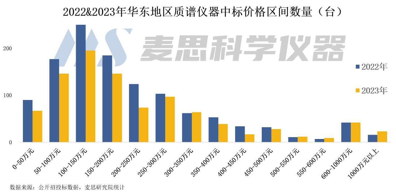 從各價(jià)格區(qū)間的中標(biāo)數(shù)量來看,華東地區(qū)質(zhì)譜儀器中標(biāo)單價(jià)主要集中在350萬元以內(nèi),占比超80%。其中,中標(biāo)單價(jià)在100-150萬元以內(nèi)的質(zhì)譜儀器數(shù)量最多,2023年中標(biāo)數(shù)量占比為20%;其次為50-100萬元以及150-200萬元的質(zhì)譜儀,占比均為15%。