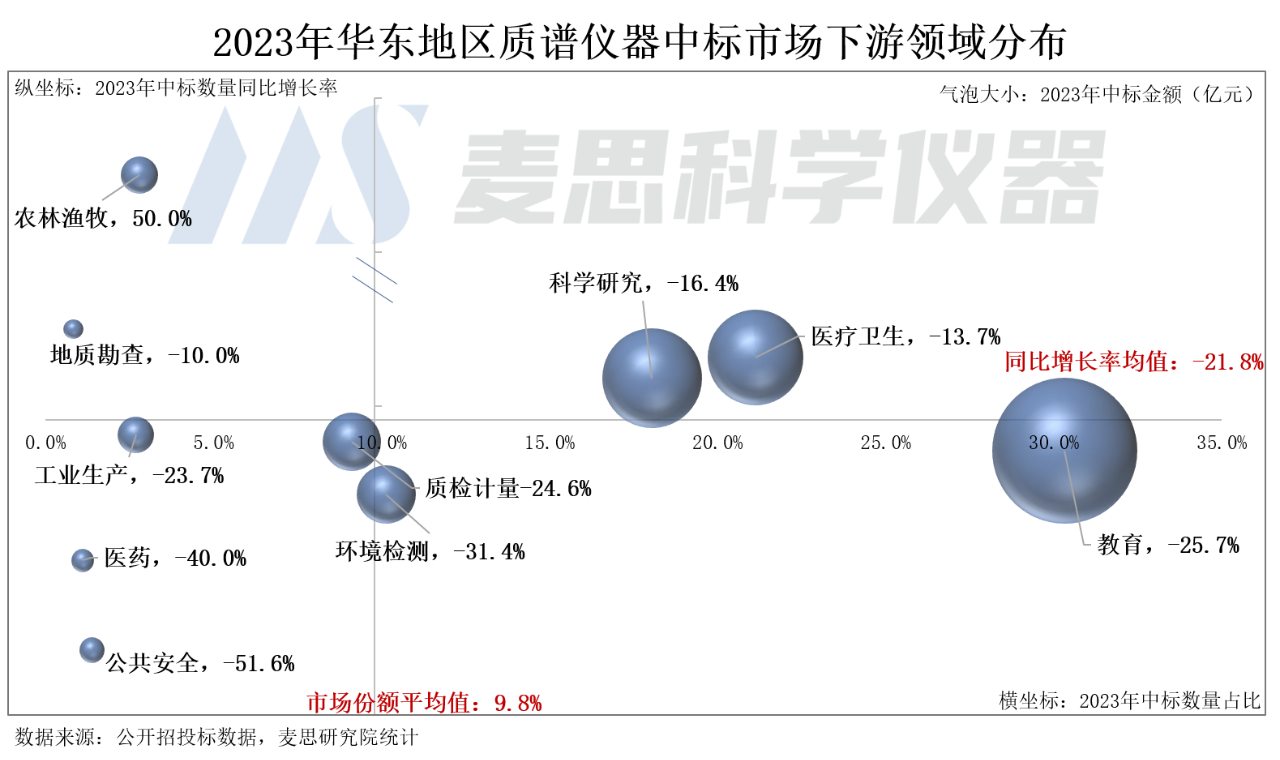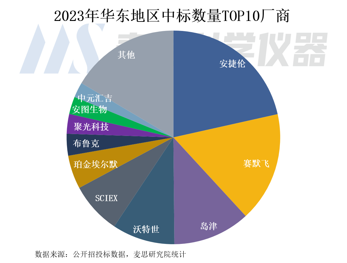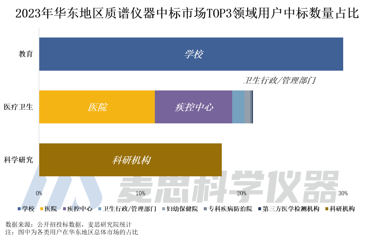 科學(xué)研究領(lǐng)域的用戶為科研機(jī)構(gòu),2023年中標(biāo)數(shù)量占比接近20%,是當(dāng)前華東地區(qū)質(zhì)譜儀器中標(biāo)市場(chǎng)的第二大采購群體。