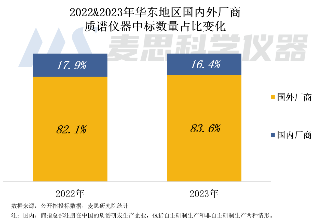 2023年華東地區(qū)國內(nèi)廠商中標(biāo)數(shù)量占比為16.4%,同比下降1.5個(gè)百分點(diǎn)。國外廠商中標(biāo)數(shù)量占比為83.6%,高于全國市場(chǎng)平均值(76%),占據(jù)市場(chǎng)主導(dǎo)地位。從二者占比變化可見,2023年國內(nèi)廠商的質(zhì)譜儀器中標(biāo)數(shù)量下降幅度高于國外廠商。