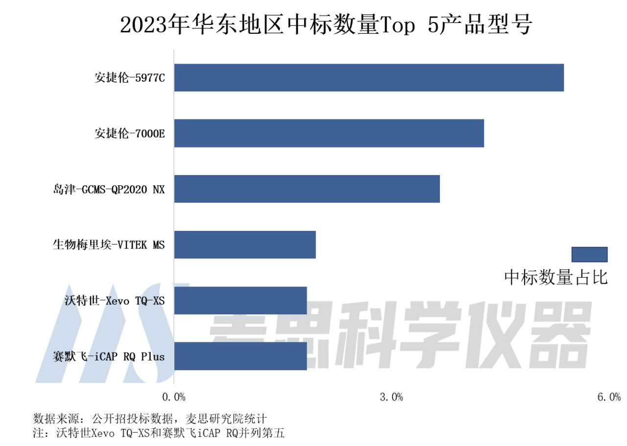從產(chǎn)品型號(hào)來看,2023年華東地區(qū)質(zhì)譜儀器中標(biāo)數(shù)量Top 5產(chǎn)品分別為安捷倫-5977C、安捷倫-7000E、島津-GCMS-QP2020 NX、生物梅里埃-VITEK MS、沃特世-Xevo TQ-XS和賽默飛-iCAP RQ Plus(并列)。