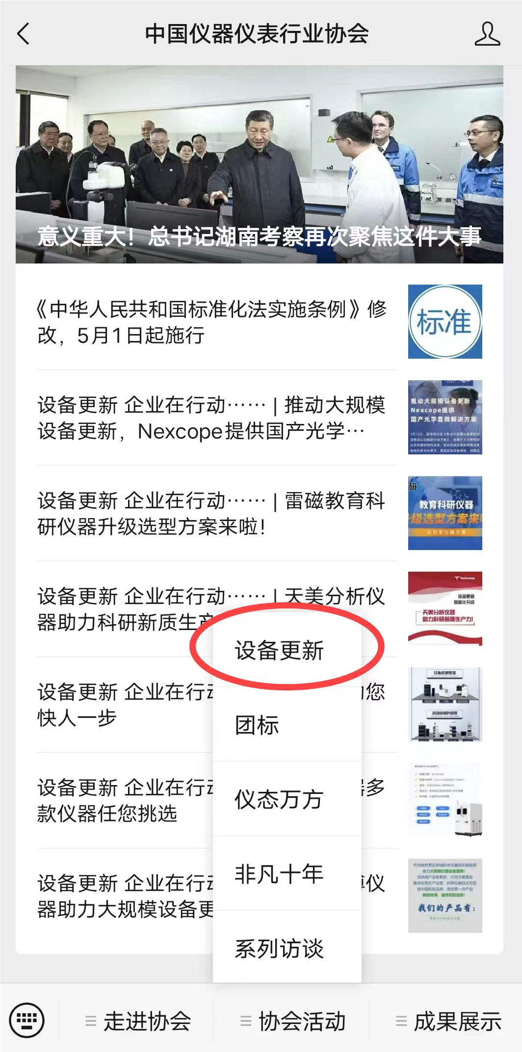 請關注中國儀器儀表行業協會公眾號,點擊主頁下方“協會活動”中“設備更新”專欄,即可參考部份已發布信息,請見下列圖示,讓我們一起“在行動”!