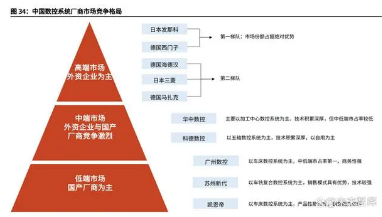 2017 年中國科技專項后,數控系統國產化率實現提升,打破高端市場外資壟 斷局面,但目前中高端市場仍以外資為主,這主要是由于數控系統的技術壁壘與 較高的用戶粘性。目前中國數控系統市場中:高端市場以外資企業為主,其中第一梯隊代表為日本發那科、德國西門子,第二 梯隊代表為德國海德漢、日本三菱、德國馬扎克;中端市場面臨外資企業與國產廠商的激烈競爭,其中國產品牌華中數控主要以加 工中心數控系統為主、技術積累深厚,科德數控以五軸數控系統為主,技術積累 深厚,以自用為主;低端市場以國產廠商為主,如廣州數控(以車床數控系統為主,中低端市占率第一,商務性強)、蘇州新代(以車銑復合數控系統為主,銷售模式具有優勢,技 術較強)、凱恩帝(以車床數控系統為主,產品性能較好,銷售能力較弱)。