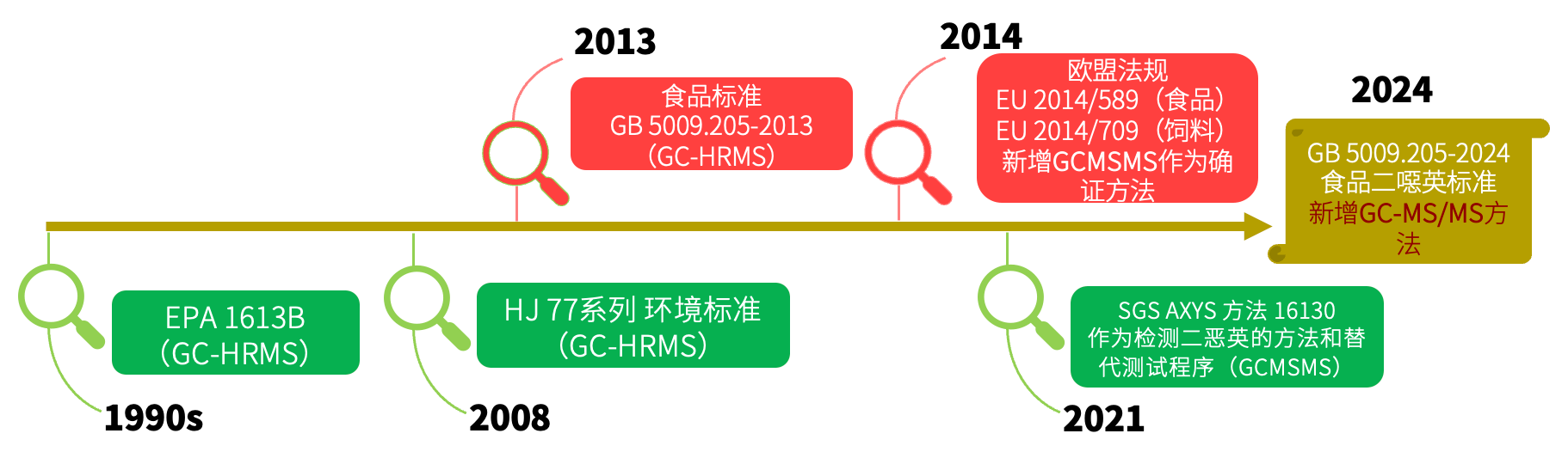 長(zhǎng)久以來,高分辨磁質(zhì)譜(GC-HRMS)被譽(yù)為二噁英分析的“黃金標(biāo)準(zhǔn)”,國內(nèi)外二噁英檢測(cè)標(biāo)準(zhǔn)也主要以GC-HRMS為主。歐盟于2014年發(fā)布了EU 2014/589和EU 2014/709號(hào)法規(guī),具有里程碑式意義,首次將氣相色譜-三重四極桿質(zhì)譜儀(GC-MS/MS)作為評(píng)判食品和飼料中二噁英及類二噁英多氯聯(lián)苯是否符合歐盟最高限值要求的確認(rèn)方法。