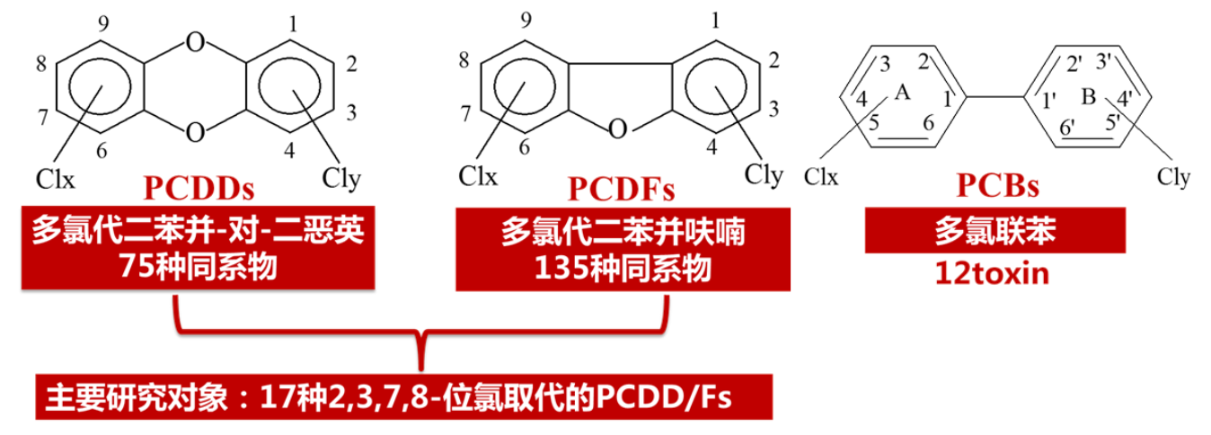 二噁英及其類似物是一類含有苯環(huán)結(jié)構(gòu)的特定有機(jī)化合物的總稱,包括多氯代二苯并二噁英(PCDDs)和多氯代二苯并呋喃(PCDFs)和類二噁英多氯聯(lián)苯(DL-PCBs)等,具有持久性、生物富集、長(zhǎng)距離遷移和生物毒性等特點(diǎn)。其中以17種2,3,7,8位氯取代的PCDD/Fs和12種DL-PCBs同族體被認(rèn)為對(duì)人類和生物危害最嚴(yán)重。