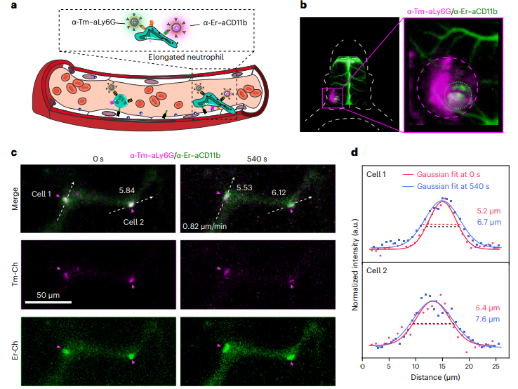 其中,團隊利用開發(fā)的新型近紅外二區(qū)稀土熒光探針特異性的標記了小鼠的中性粒細胞以研究炎癥血管中活化中性粒細胞的體內(nèi)成像(圖2)。中性粒細胞能夠在血管內(nèi)壁爬行到外滲部位,然后外滲是中性粒細胞活化的典型特征。CD11b是一種介導(dǎo)細胞粘附和遷移的中性粒細胞表面蛋白,在活化的中性粒細胞表面表達上調(diào)。中性粒細胞上Ly6G和CD11b蛋白的雙重標記有助于在體內(nèi)特異性地跟蹤活化的中性粒細胞。因此,在缺血性腦卒中小鼠模型中,靜脈注射抗ly6g抗體偶聯(lián)的α-TmNPs和抗cd11b抗體偶聯(lián)的α-ErNPs (α-Er-aCD11b),標記活化的中性粒細胞,雙標記的中性粒細胞表現(xiàn)出微弱的運動、滾動和爬行,表明它們在內(nèi)皮細胞表面粘附牢固。此外,可以觀察到雙標記的中性粒細胞,沿著血流的剪切力被拉長,這通常被認為是中性粒細胞通過炎癥血管外滲的最后一步。