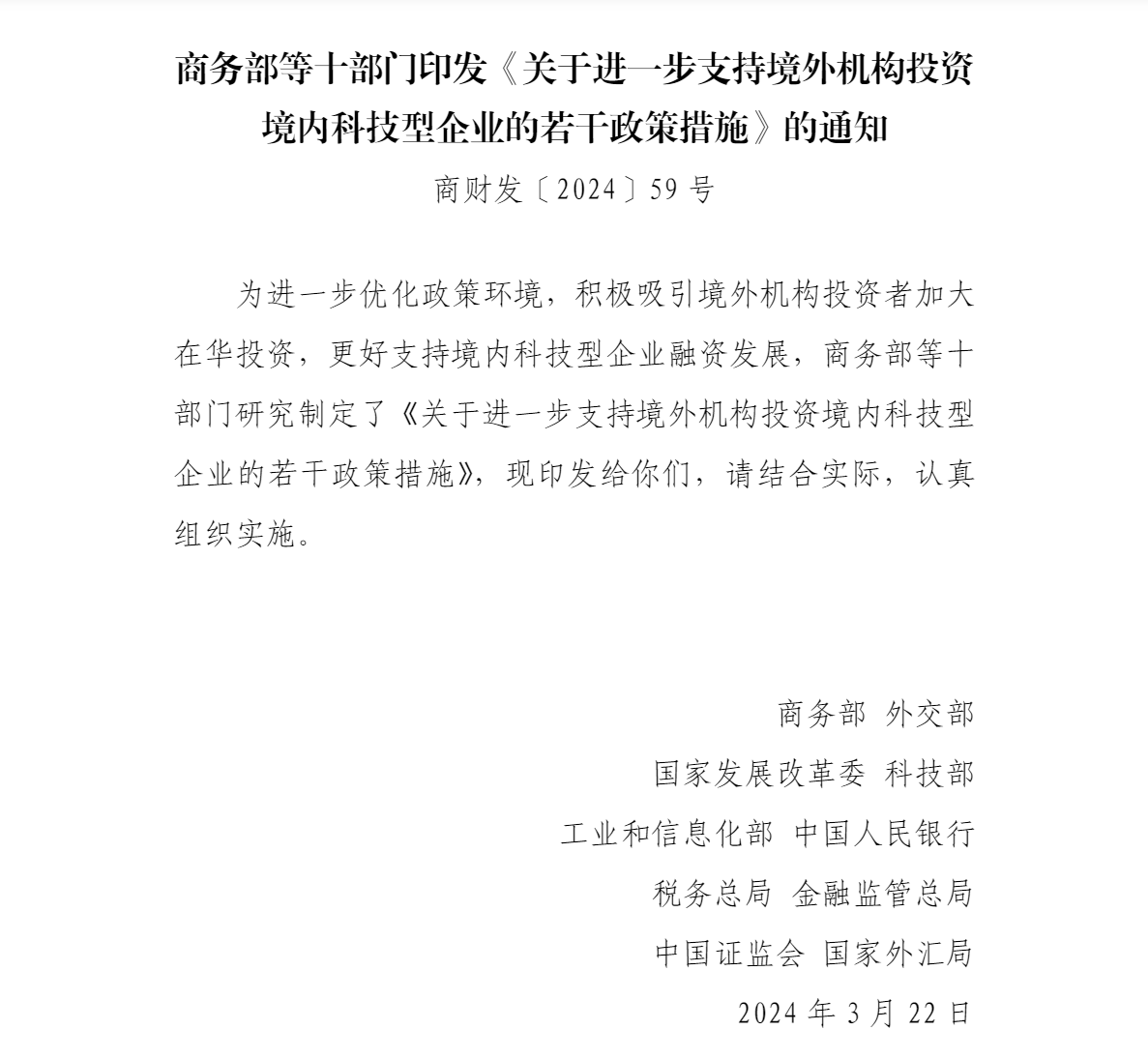 請各有關(guān)部門高度重視、加強配合、整合資源、優(yōu)化服務,做好境外機構(gòu)投資境內(nèi)科技型企業(yè)各項工作,推動形成綜合化科技金融服務體系,營造更加優(yōu)化的政策環(huán)境,更好發(fā)揮金融對科技創(chuàng)新的支持作用,穩(wěn)定投資預期,提振投資信心。