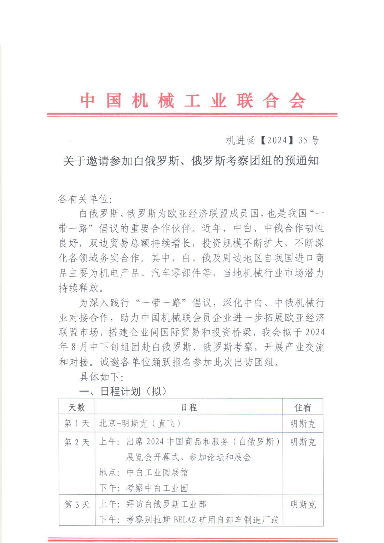 為深入踐行“一帶一路”倡議,深化中白、中俄機(jī)械行業(yè)對(duì)接合作,助力中國(guó)機(jī)械聯(lián)會(huì)員企業(yè)進(jìn)一步拓展歐亞經(jīng)濟(jì)聯(lián)盟市場(chǎng),搭建企業(yè)間國(guó)際貿(mào)易和投資橋梁,中國(guó)機(jī)械工業(yè)聯(lián)合會(huì)擬于2024年8月中下旬組團(tuán)赴白俄羅斯、俄羅斯考察,開展產(chǎn)業(yè)交流和對(duì)接?,F(xiàn)將活動(dòng)通知發(fā)布如下。
