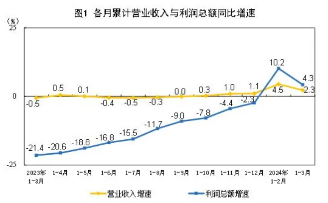 1-3月份,規模以上工業企業實現營業收入30.96萬億元,同比增長2.3%;發生營業成本26.38萬億元,增長2.5%;營業收入利潤率為4.86%,同比提高0.09個百分點。