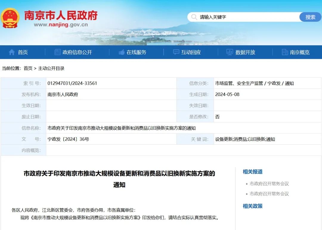 5月10日,從南京市人民政府官網(wǎng)獲悉,《南京市推動(dòng)大規(guī)模設(shè)備更新和消費(fèi)品以舊換新實(shí)施方案》已正式印發(fā)。