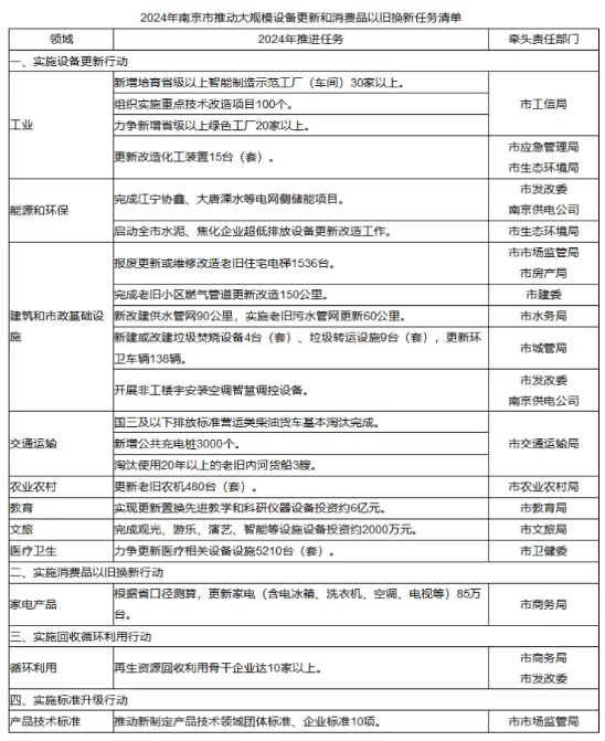 2024年南京市推動(dòng)大規(guī)模設(shè)備更新和消費(fèi)品以舊換新任務(wù)清單。
