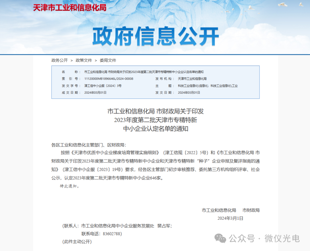 2024年3月1日,天津市工業(yè)和信息化局官方網(wǎng)站發(fā)布了《市工業(yè)和信息化局 市財(cái)政局關(guān)于印發(fā)2023年度第二批天津市專精特新中小企業(yè)和天津市專精特新“種子”企業(yè)申報(bào)及復(fù)評(píng)指南的通知》,微儀光電(天津)有限公司(以下簡(jiǎn)稱“微儀光電”)榜上有名,獲評(píng)“專精特新”中小企業(yè)稱號(hào)!這是一項(xiàng)非常重要的榮譽(yù),也是我公司多年專注技術(shù)創(chuàng)新和不斷提升核心競(jìng)爭(zhēng)力的成果。