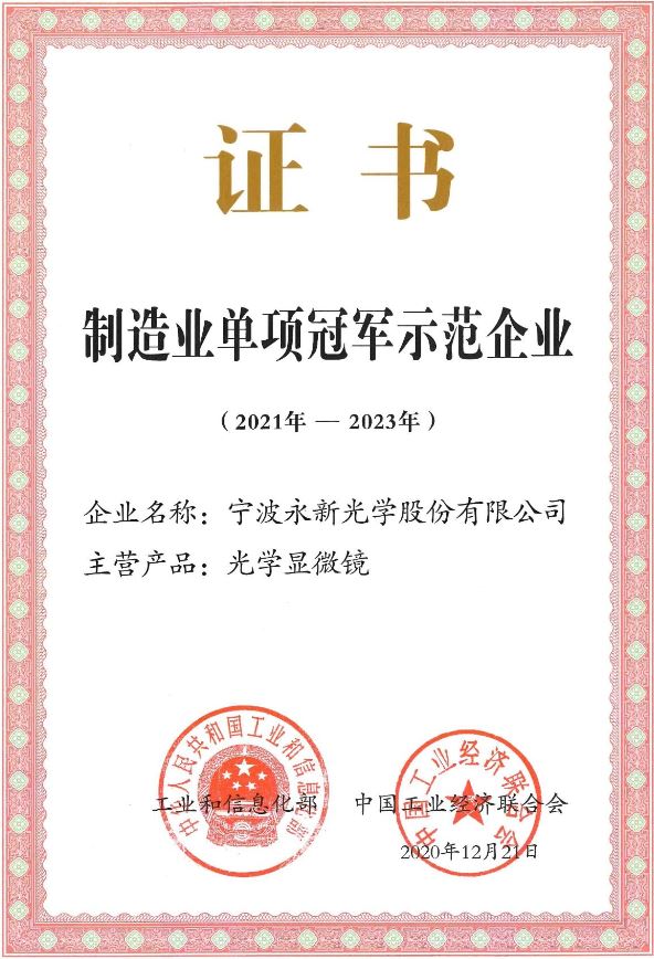 公司于2017年參與國家第二批制造業(yè)單項(xiàng)冠軍企業(yè)評選,并憑借產(chǎn)品——光學(xué)顯微鏡,成功入選第二批國家制造業(yè)單項(xiàng)冠軍培育企業(yè)。按照國家工信部要求,本次成功通過復(fù)評升級為國家級制造業(yè)“單項(xiàng)冠軍示范企業(yè)”,這既是國家與市場對永新光學(xué)產(chǎn)品的肯定,也是永新光學(xué)自身實(shí)力強(qiáng)有力的證明,有助于更好激發(fā)公司不斷開拓創(chuàng)新,積極研發(fā)新產(chǎn)品。
