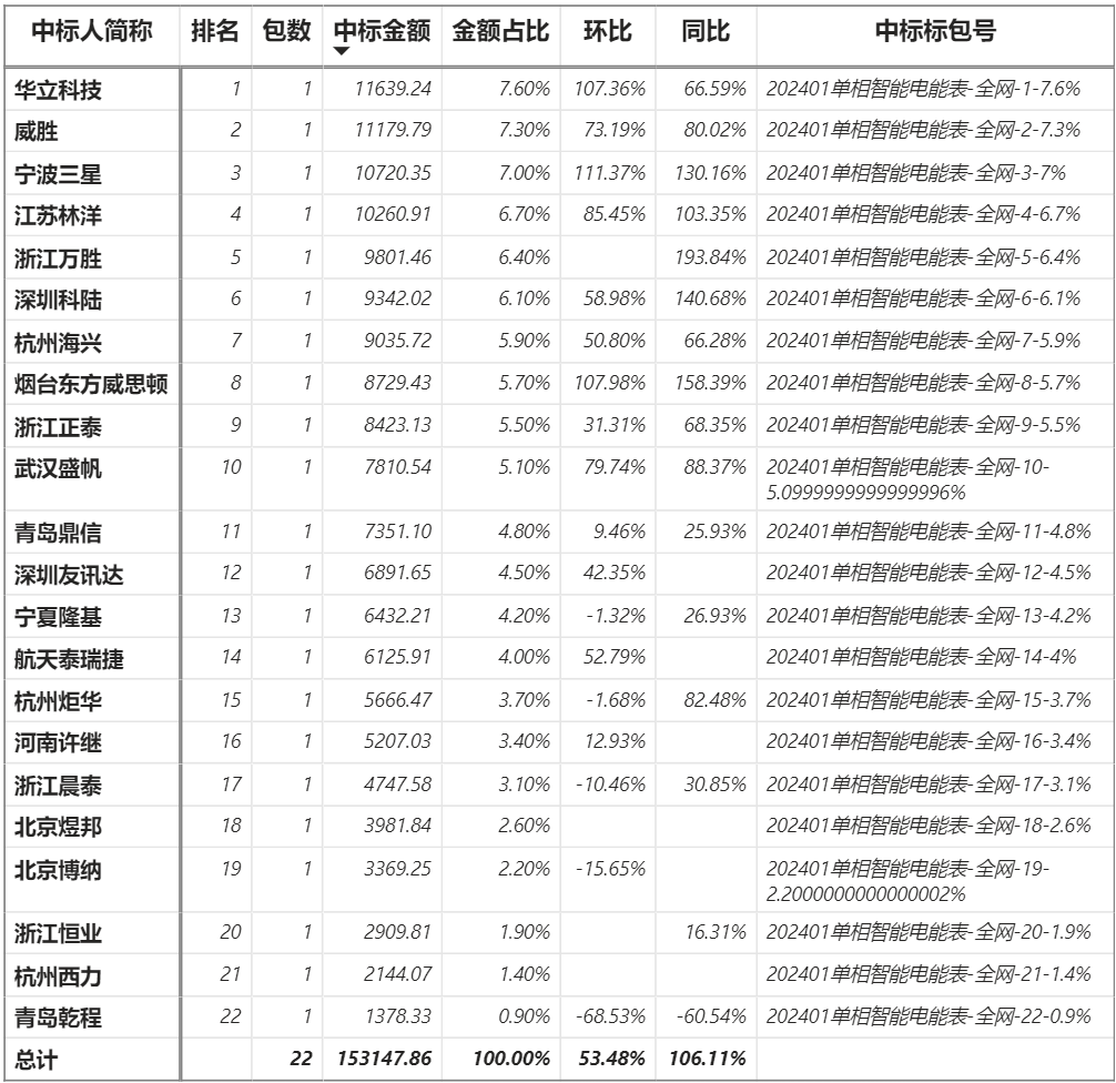 總金額15.31億元,22家企業實現中標,華立中標最大包1.16億元;