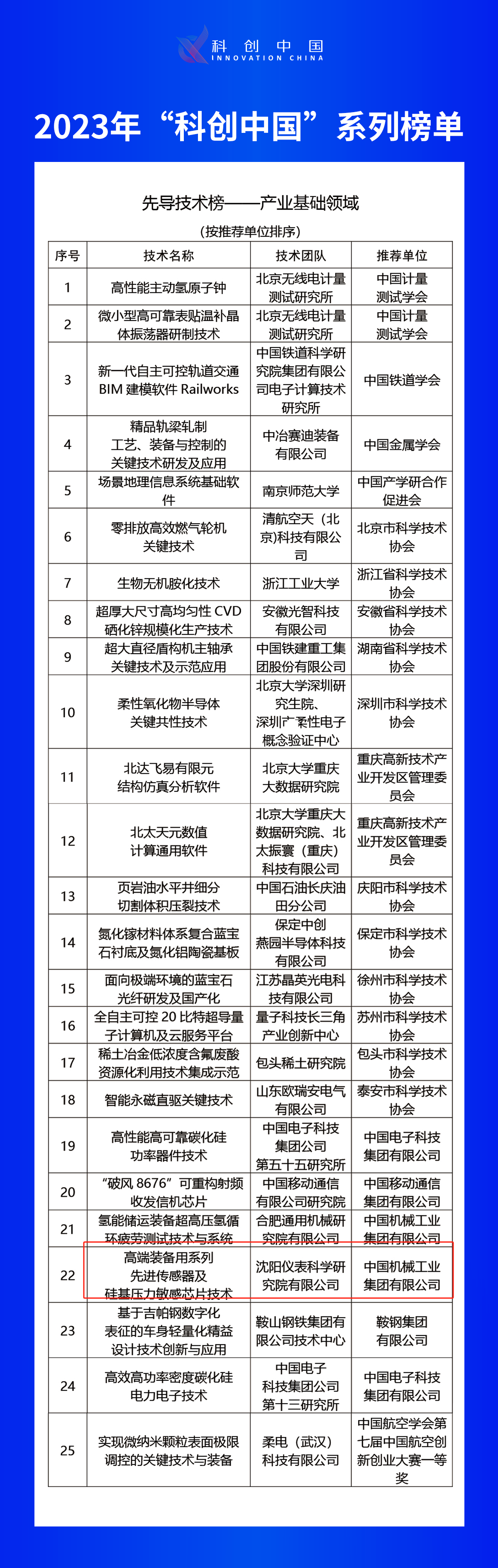 7月2日,2023年“科創(chuàng)中國”系列榜單在第二十六屆中國科協(xié)年會上發(fā)布,傳感器國家工程研究中心的“高端裝備用系列先進(jìn)傳感器及硅基壓力敏感芯片技術(shù)” 入選年度先導(dǎo)技術(shù)榜!