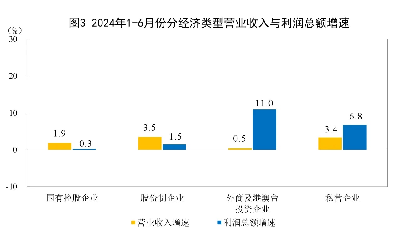 1—6月份,規模以上工業企業中,國有控股企業實現利潤總額12083.9億元,同比增長0.3%;股份制企業實現利潤總額26243.3億元,增長1.5%;外商及港澳臺投資企業實現利潤總額8614.9億元,增長11.0%;私營企業實現利潤總額9193.6億元,增長6.8%