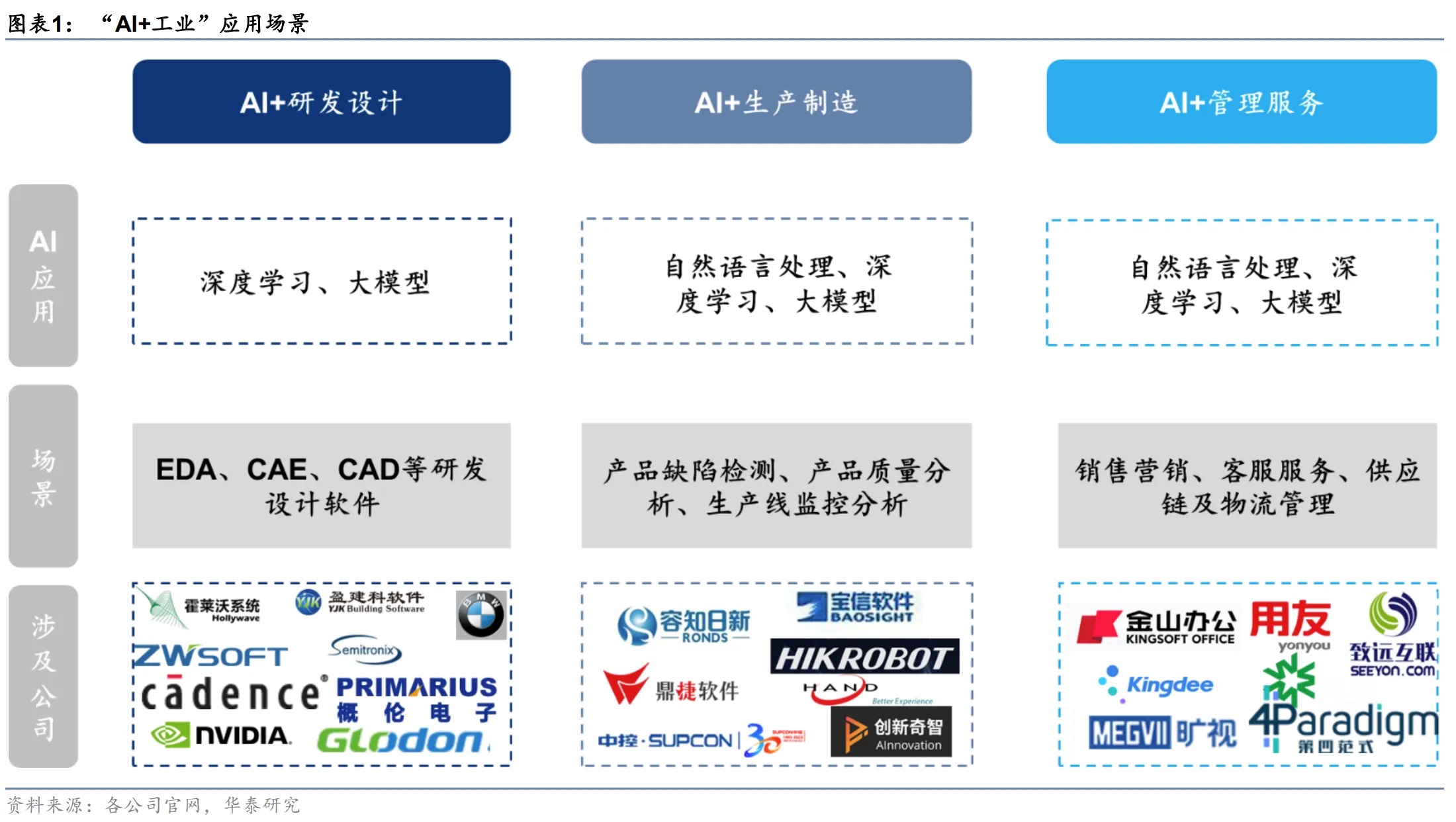 我們看好:1)研發(fā)設(shè)計,AI有望增進用戶使用EDA/CAD設(shè)計及CAE仿真優(yōu)化等軟件的效率;2)生產(chǎn)制造,AI有望強化工業(yè)機器人的信息處理、感知執(zhí)行等能力;3)管理服務(wù),AI已經(jīng)被用于基本辦公領(lǐng)域,預(yù)計未來將進一步擴展至供應(yīng)鏈管理、客服服務(wù)和市場營銷等其他應(yīng)用場景。