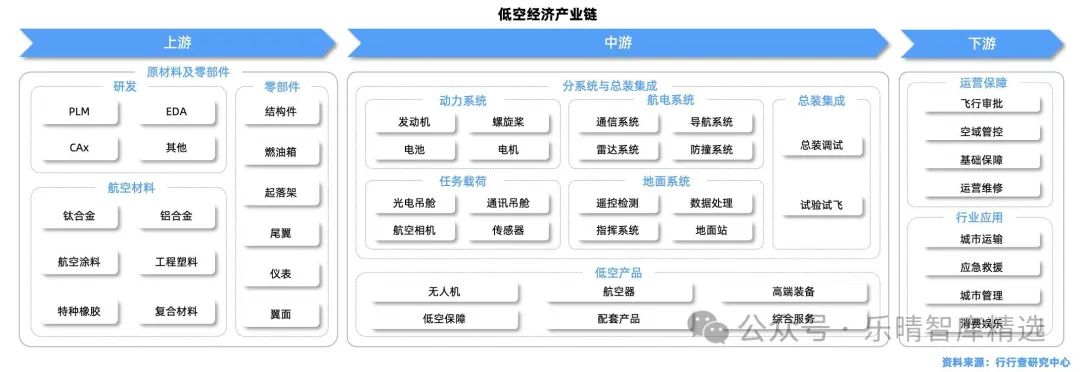 中游聚焦于分系統(tǒng)與總裝集成、低空產(chǎn)品的研發(fā)與生產(chǎn),涵蓋動(dòng)力系統(tǒng)、航電系統(tǒng)、無人機(jī)、航空器等。