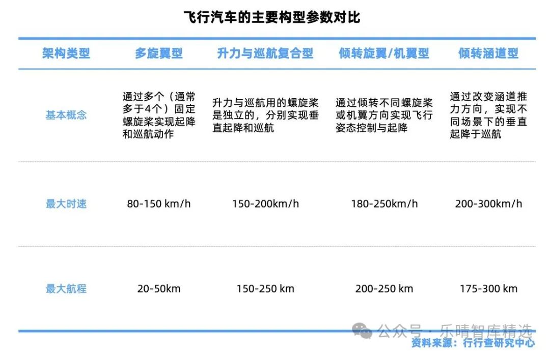 飛行汽車主要架構(gòu)包括多旋翼型、升力與巡航復(fù)合型、傾轉(zhuǎn)旋翼/機(jī)翼型、傾轉(zhuǎn)涵道型。