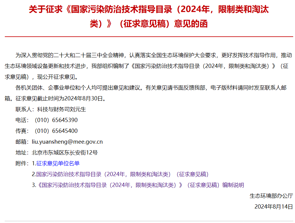 為更好發(fā)揮技術(shù)指導(dǎo)作用,推動(dòng)生態(tài)環(huán)境領(lǐng)域設(shè)備更新和技術(shù)進(jìn)步,生態(tài)環(huán)境部日前發(fā)布關(guān)于征求《國家污染防治技術(shù)指導(dǎo)目錄(2024年,限制類和淘汰類)》(征求意見稿)意見的函,向有關(guān)單位征求意見。