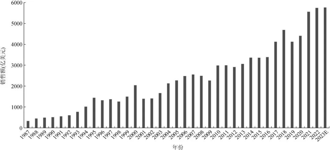在美國“逆全球化”系列政策下,全球集成電路產業自2022年下半年以來顯著萎縮。根據世界半導體貿易統計組織(WSTS)2023年11月的預測,2023年全球半導體市場萎縮9.4%,預計市場規模降至5201.26億美元,盡管在2024年出現強勁增長13.1%至5883.64億美元,但也僅僅略高于2022年5740.84億美元的水平(圖1)。