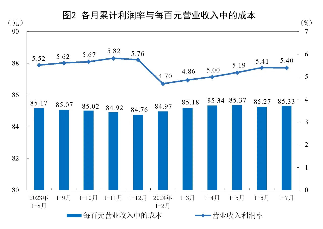 1—7月份,規(guī)模以上工業(yè)企業(yè)實(shí)現(xiàn)營業(yè)收入75.93萬億元,同比增長2.9%;發(fā)生營業(yè)成本64.79萬億元,增長3.0%;營業(yè)收入利潤率為5.40%,同比提高0.04個(gè)百分點(diǎn)。