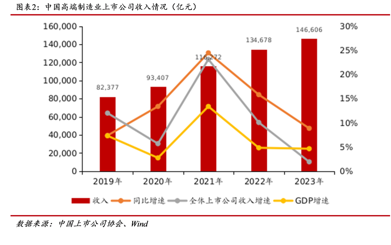 過去5年,我國高端制造業上市公司收入規模持續增長,由2019年的8.24萬億元增長至2023年的14.66萬億元,復合增長率為15.50%,收入增速顯著高于GDP增速,表明高端制造業上市公司仍處于快速發展階段,同時仍是拉動我國經濟增長的強勁動力之一。2023年,在復雜的國際形勢和國內外需求下降的背景下,高端制造業上市公司營業收入同比增速下降至8.86%,但仍大幅領先于A股上市公司2023年整體收入同比增速1.93%,表現出了強勁的發展韌性
