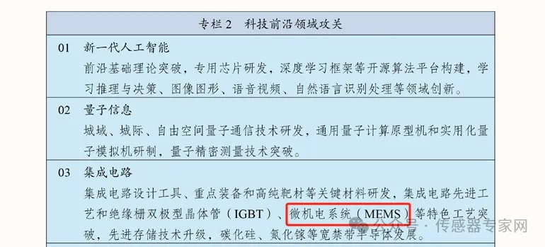 2021年3月,“十四五”規(guī)劃發(fā)布,將智能傳感器重要制造技術(shù)——MEMS(微機電系統(tǒng))工藝,寫入【科技前沿領(lǐng)域攻關(guān)】技術(shù)項目中。