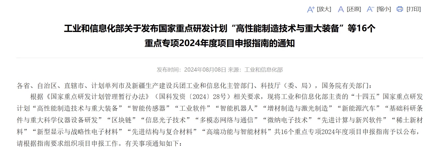 近期,工信部國家重點研發計劃2024年度項目申報指南發布,共涵蓋高端功能與智能材料、先進結構與復合材料、新型顯示與戰略性電子材料、高性能制造技術與重大裝備、微納電子技術、新能源汽車等在內16個重點專項。
