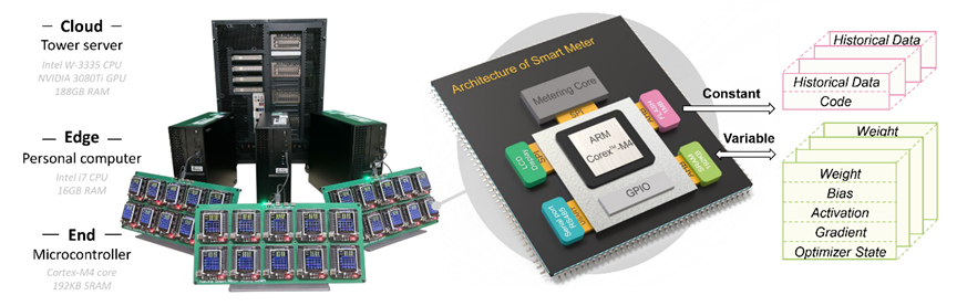 目前市場化的智能電表產品僅具備電能計量和雙向通訊的功能。如果智能電表能夠在本地對收集的海量數據進行智能分析處理,電力系統可以在無需額外投資的情況下提高能源管理效率、降低用戶電力消費、以及緩解云平臺計算壓力。然而,智能電表的內存、計算和通信硬件資源和數據資源有限,難以支撐復雜的神經網絡訓練任務。為此,該論文通過結合聯邦學習和分割學習,提出了一種創新的云-邊-端架構,有效解決了智能電表在硬件資源和數據資源方面的雙重限制的問題。