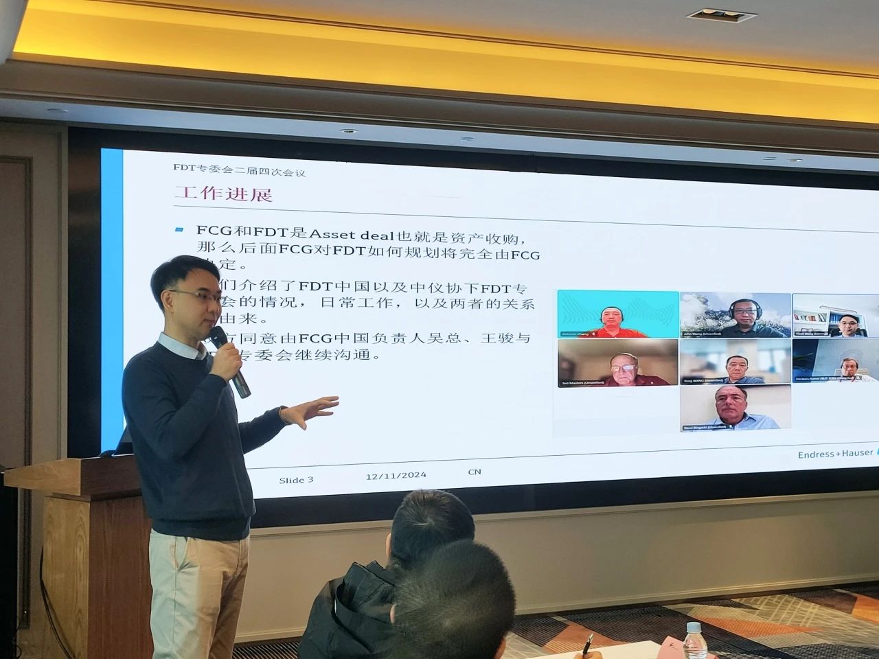 會議于上午9點準時開始,中國FDT專委會常務副主任委員,來自恩德斯豪斯的王奕瑋先生向參加本次會議的全體代表致歡迎詞,向大家介紹了FDT專委會在今年下半年與國際FCG組織的溝通、合作進展,以及對專委會2025年各項重點工作的初步設想。隨后進行了本次會議的一項重要提案表決 -- 專委會委員單位及人員調(diào)整方案:增補章安冬為委員單位美名軟件代表;增補FCG為常委單位,王駿為代表。以上提案經(jīng)現(xiàn)場代表一致通過并立即生效。